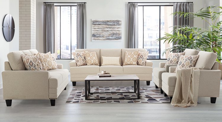 Elevate your living space with this sophisticated sofa set, adorned with antique brass nail head trim, offering a perfect blend of luxury and comfort. Its contemporary design and plush seating are crafted for those who aspire to a lifestyle of elegance and superior comfort. This sofa set is not just furniture; it's a statement of refined taste.
