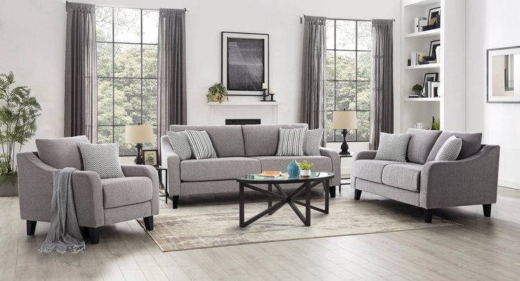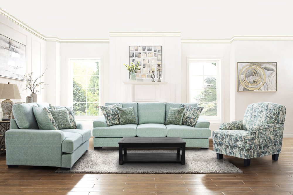 This sofa set embodies a contemporary aesthetic with its clean lines, complemented by blue pillows for a pop of color. The plush cushioning ensures comfort, while the modern design invites a stylish yet relaxed atmosphere.