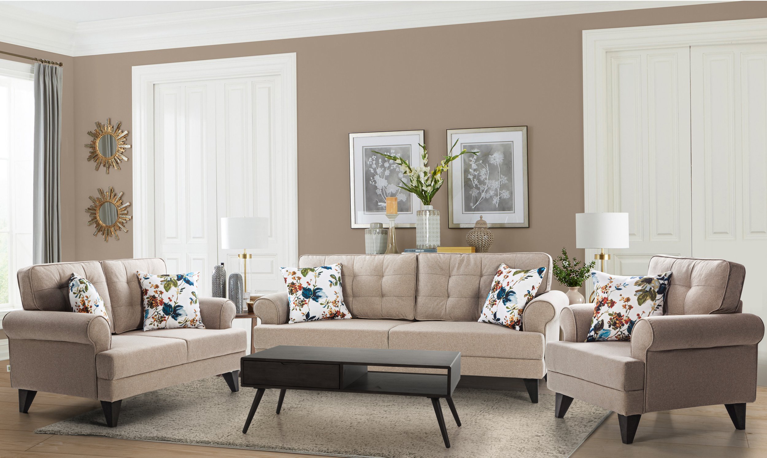 Clean yet comfortable, our Los Angeles sofas strike a perfect balance of elegance. The sofas are fitted with tufted backrests and tapered wooden legs with delicate gold trimming. The deep base encourages hours of lounging.