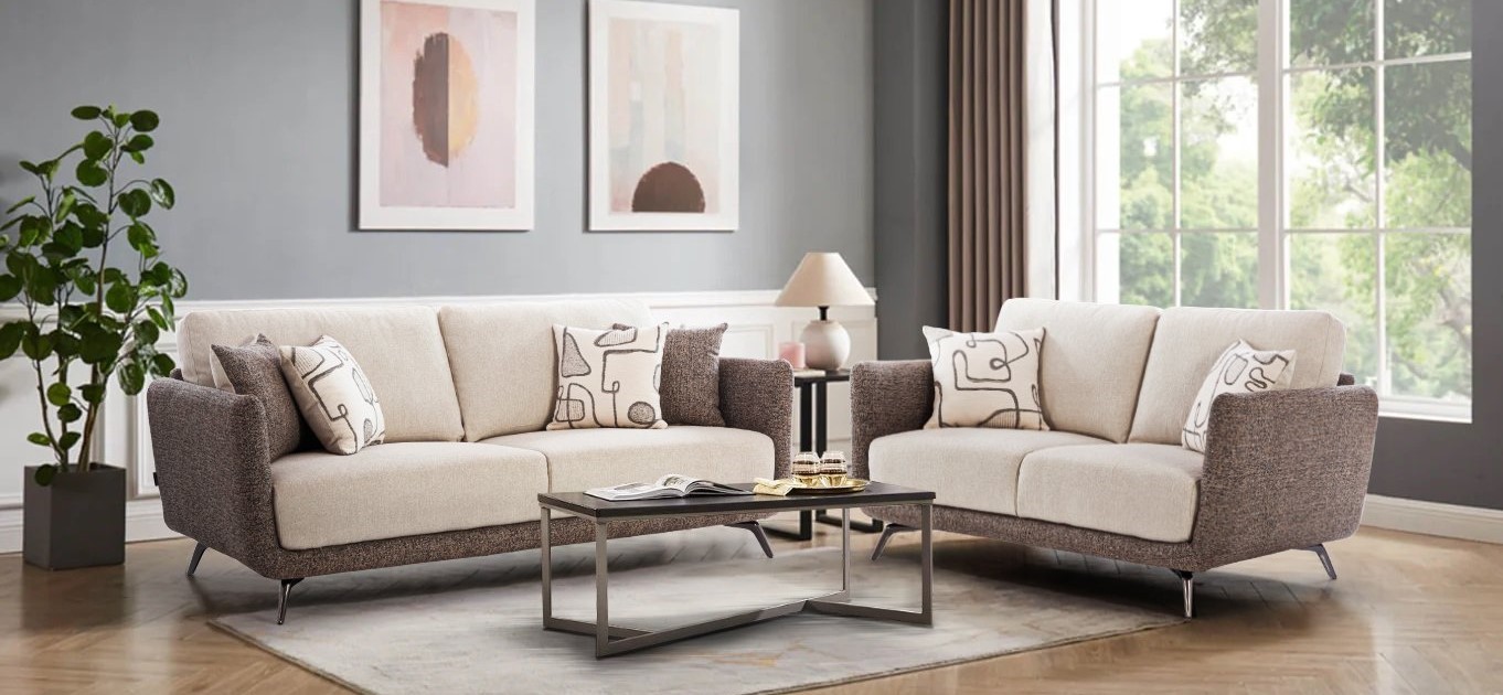 The Modern Comfort Sofa Set blends dual fabrics for a stylish look, offering plush cushions for ultimate comfort and support, perfect for any modern living space.