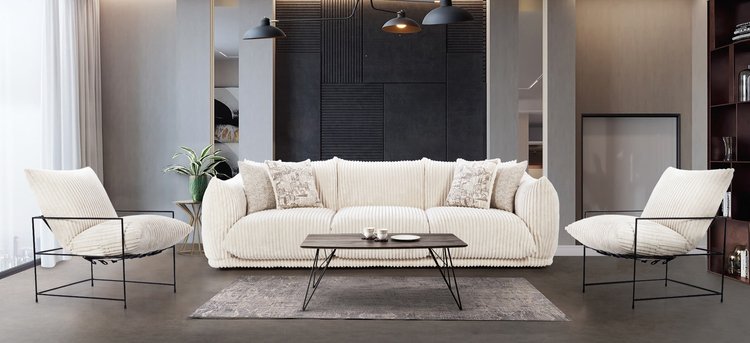 The Missisippi sofa set offers a minimalist aesthetic characterized by its clean lines and modern silhouette. Upholstered in soft corduroy fabric, this set provides a comfortable and inviting texture. Wide, padded armrests enhance the seating experience, promoting relaxation. The sturdy rectangular legs contribute to the set's durability and contemporary design.