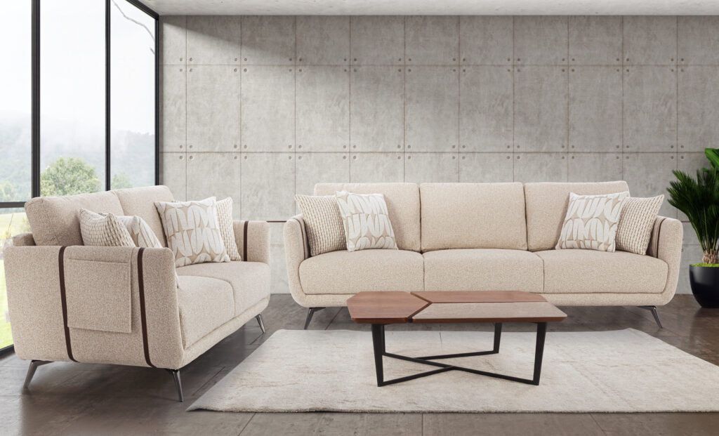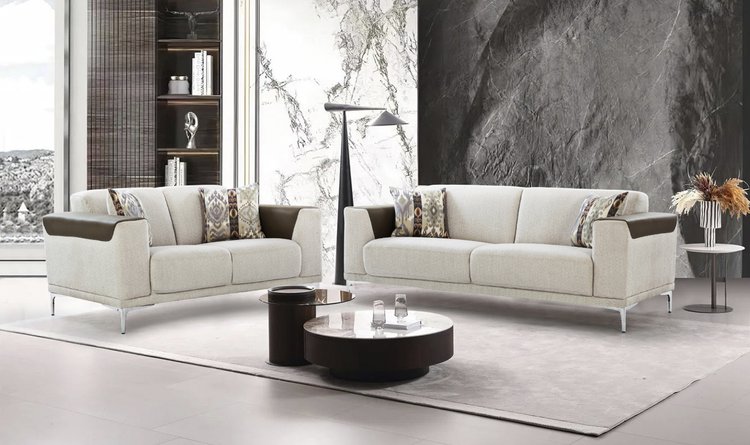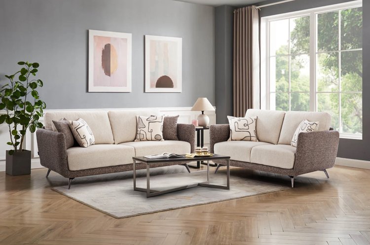 The Modern Comfort Sofa Set blends dual fabrics for a stylish look, offering plush cushions for ultimate comfort and support, perfect for any modern living space.