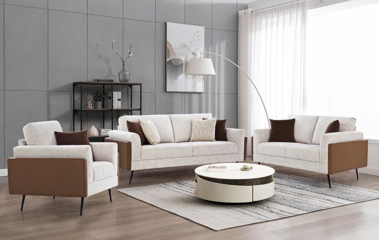 This sofa set blends dual fabric for comfort and style, complemented by durable metal legs and elegantly crafted armrests. Its modern design adds sophistication and luxury to any space, perfect for both home and office settings.