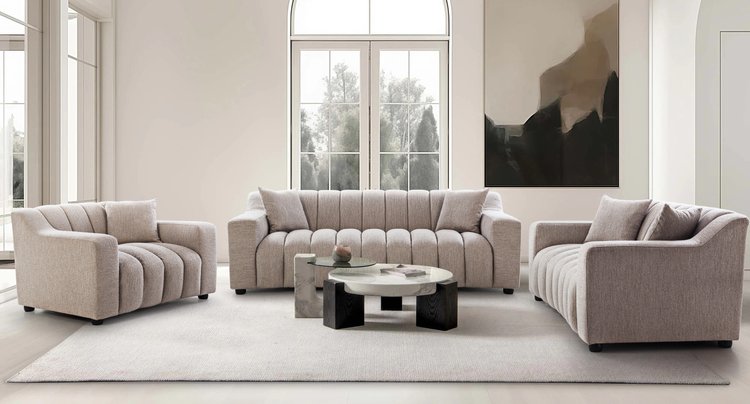 This sofa set features a ribbed design and a clean, tailored silhouette that adds a modern touch to any space. The sleek armrests provide both visual appeal and comfort, making it a perfect blend of style and functionality. Its precise craftsmanship enhances the overall design, offering both luxury and utility in one piece.