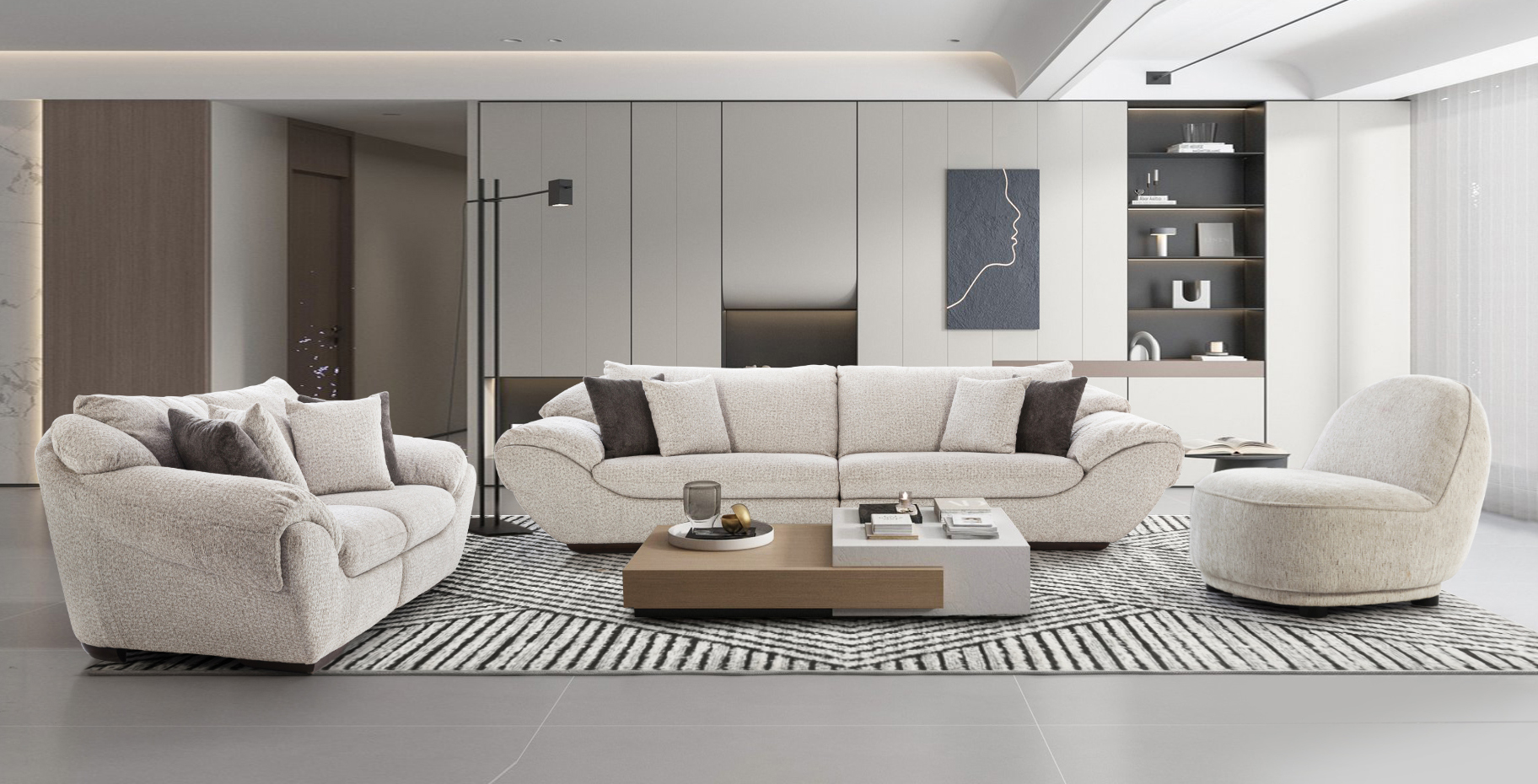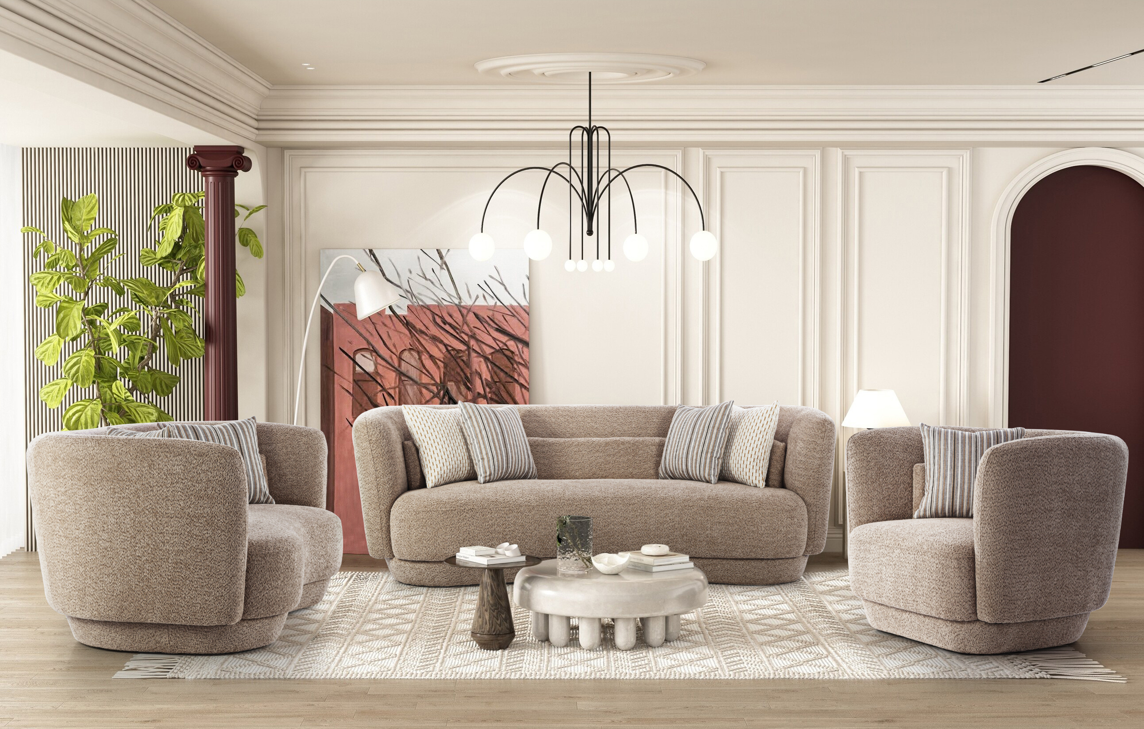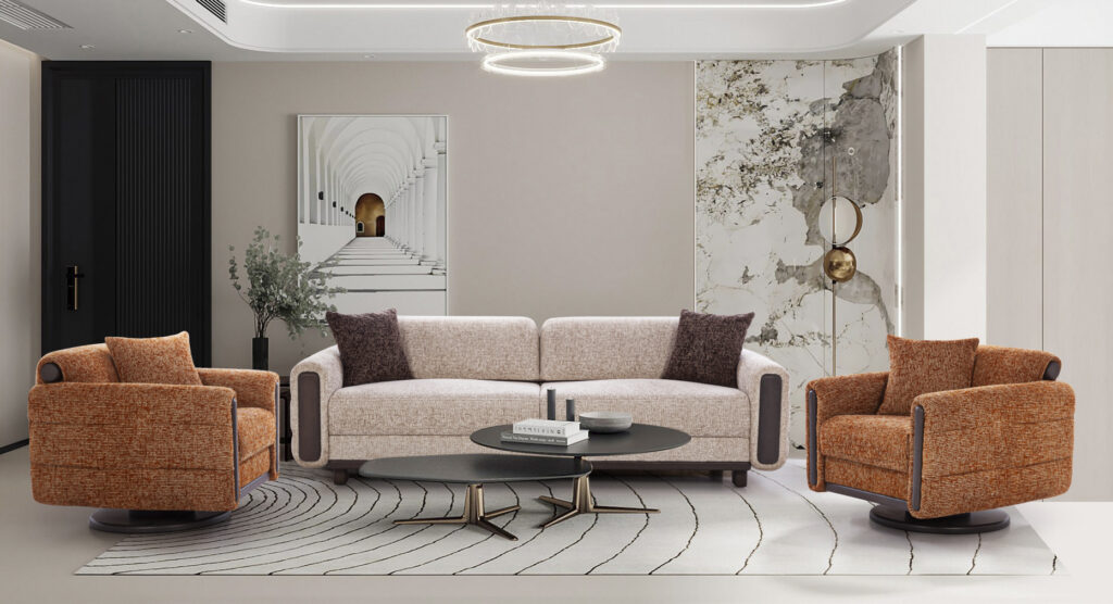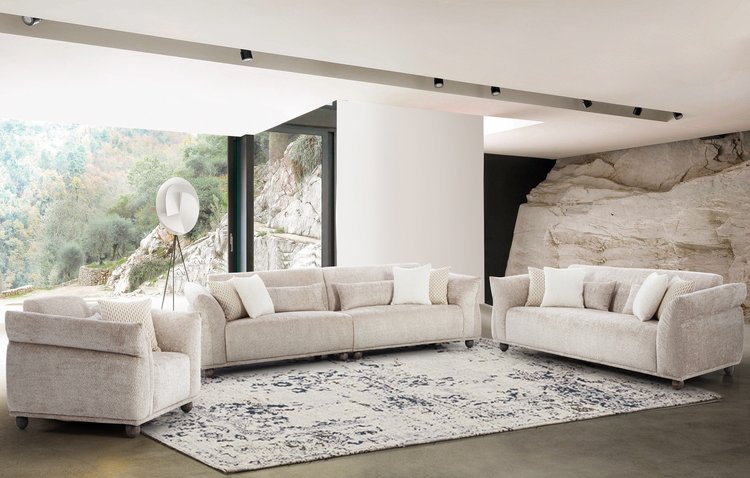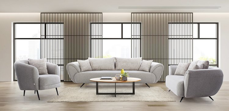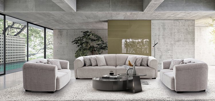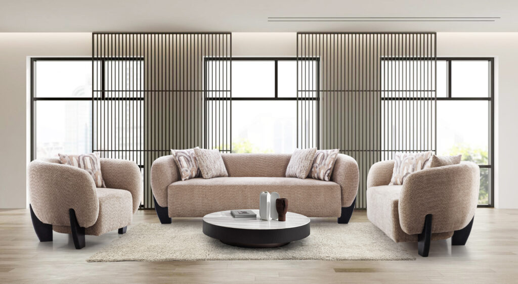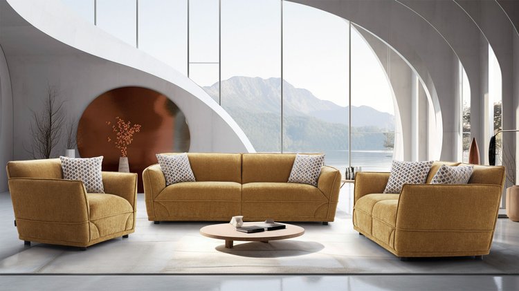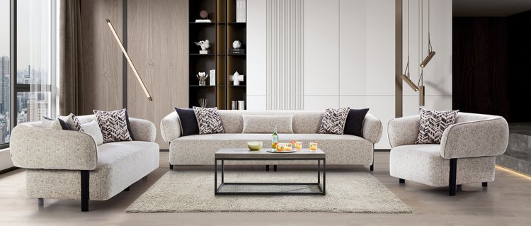 Seamless curves and a rounded armrest define the luxury of this sofa set. Its soft, textured fabric and plush cushions offer ultimate comfort and style, making it the perfect addition to any contemporary living space.