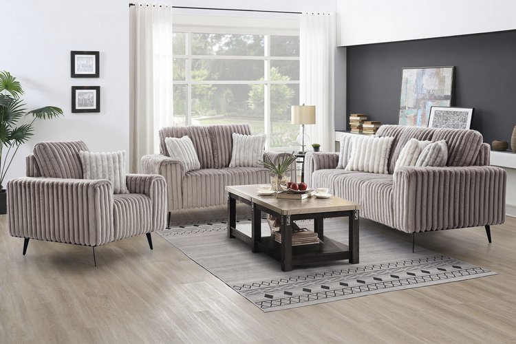 This sofa set showcases clean, defined lines with plush upholstery for ultimate comfort. The evenly spaced panels along the backrest and seat add texture, while the sleek arms enhance its modern design. Perfect for contemporary living spaces, it offers both style and comfort.