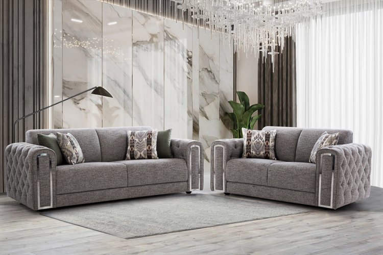 This elegant sofa set exudes contemporary charm with its sleek design and textured fabric. The quilted pattern on the arms and backrest adds a touch of sophistication, while the metallic accents offer a modern flair. Perfect for enhancing your living space with luxury and style.