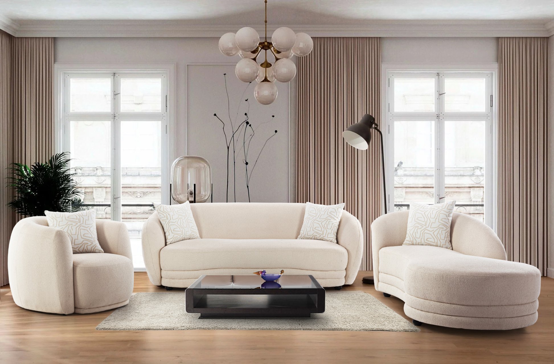 Plush curved designs, soft-textured upholstery, and elegant accent pillows bring modern charm to your living space. Crafted for ultimate comfort and durability, this versatile set complements both minimalistic and luxurious interiors, perfect for relaxing or entertaining.