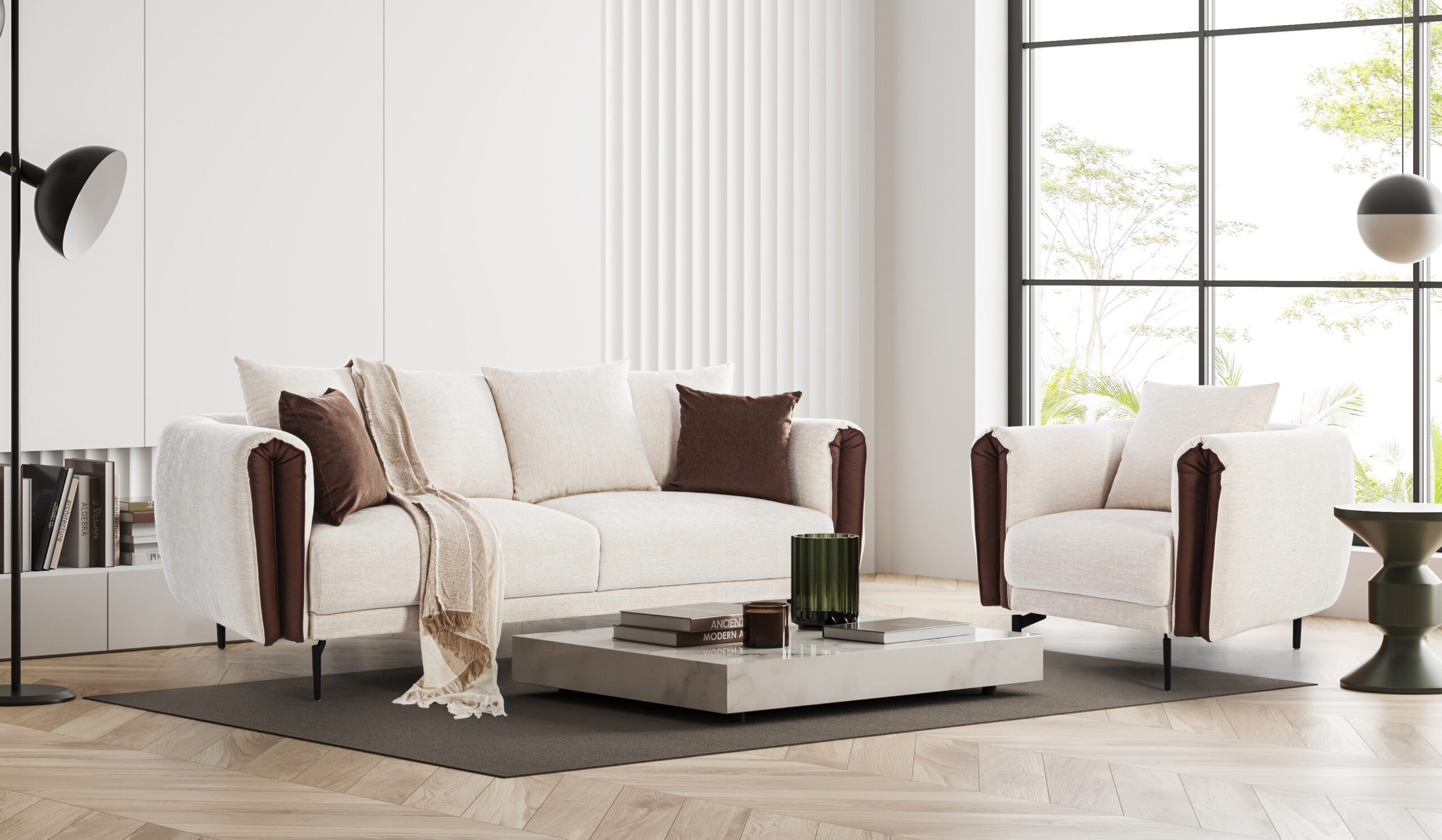 Elevate your space with the Brookfield sofa and two chairs. Embodying urban sophistication and comfort, this ensemble captures the essence of Shanghai's vitality, infusing modern design into your home.