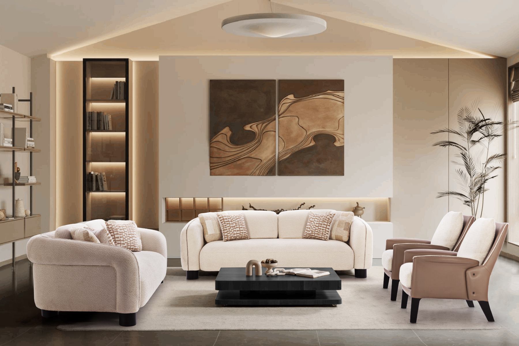 Our Palm Spring sofas epitomize contemporary design with their graceful curves and clean lines, complemented by stylish throw cushions that enhance the plush comfort and add a touch of modern elegance to this relaxing haven.