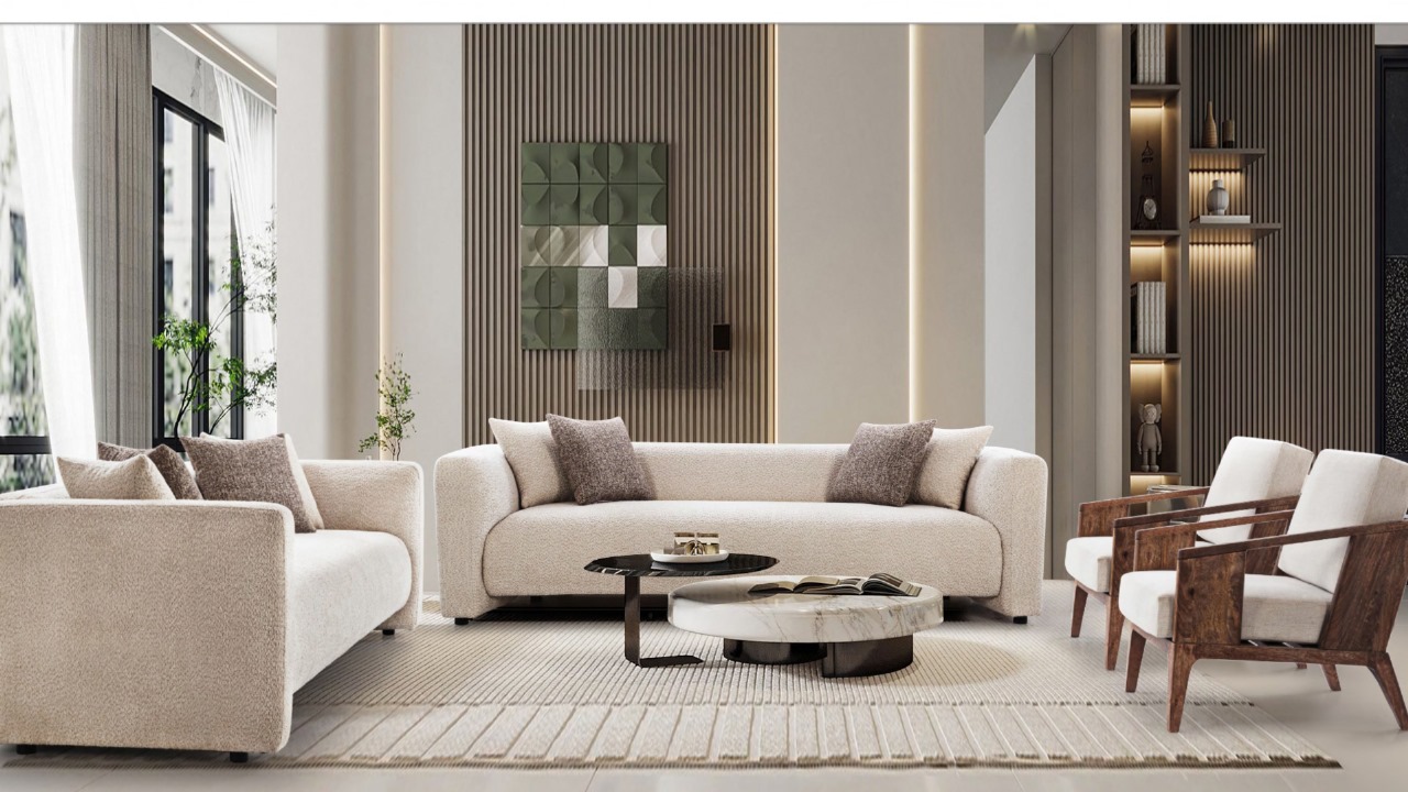 This sofa set features a sleek, structured design with clean, straight lines, offering a contemporary and modern look. The soft upholstery enhances comfort, while the neutral tones and subtle accent pillows add a sophisticated touch, making it perfect for modern living spaces.