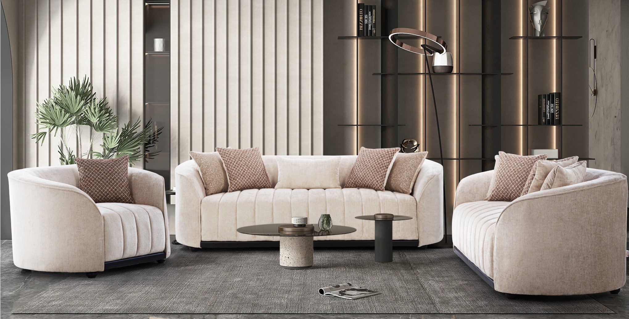 Defined by its enchanting curves and rounded armrests, this sofa set exudes luxury. Its soft upholstery and sumptuous cushions deliver unmatched comfort and style, making it the perfect enhancement for any contemporary living area.