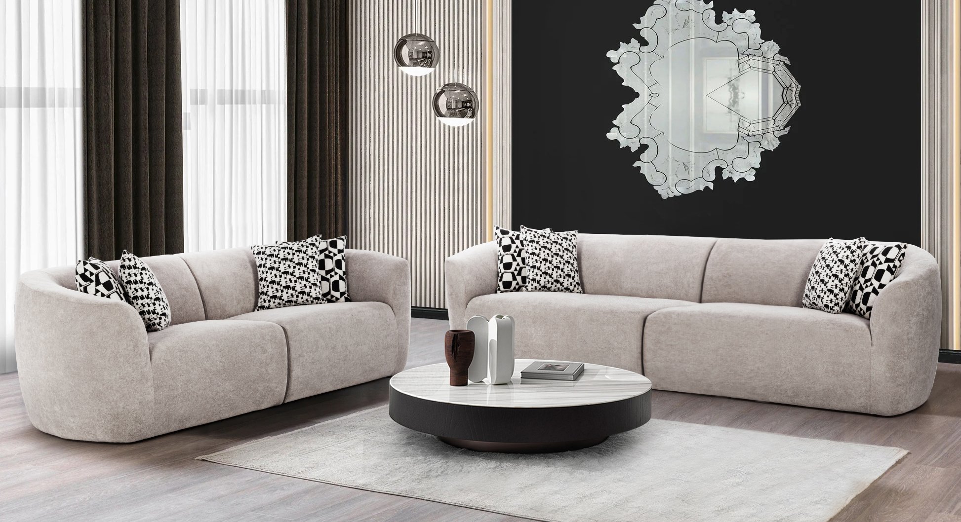 Our Palm Spring sofas epitomize contemporary design with their graceful curves and clean lines, complemented by stylish throw cushions that enhance the plush comfort and add a touch of modern elegance to this relaxing haven.