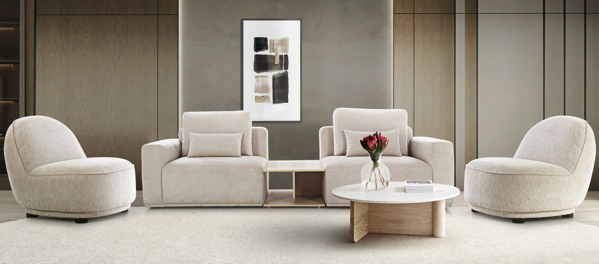 Elevate your living space with the 'Modern Master' seating collection. Crafted with premium fabrics, this ensemble offers both luxurious comfort and striking contemporary design. The set includes a sophisticated two-seater sofa and an additional chair, both featuring generously stuffed seats and backs for unparalleled relaxation. The two-seater option is available both with and without a convenient integrated console, choose further enhance the aesthetic appeal of your living room.