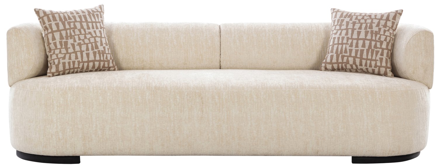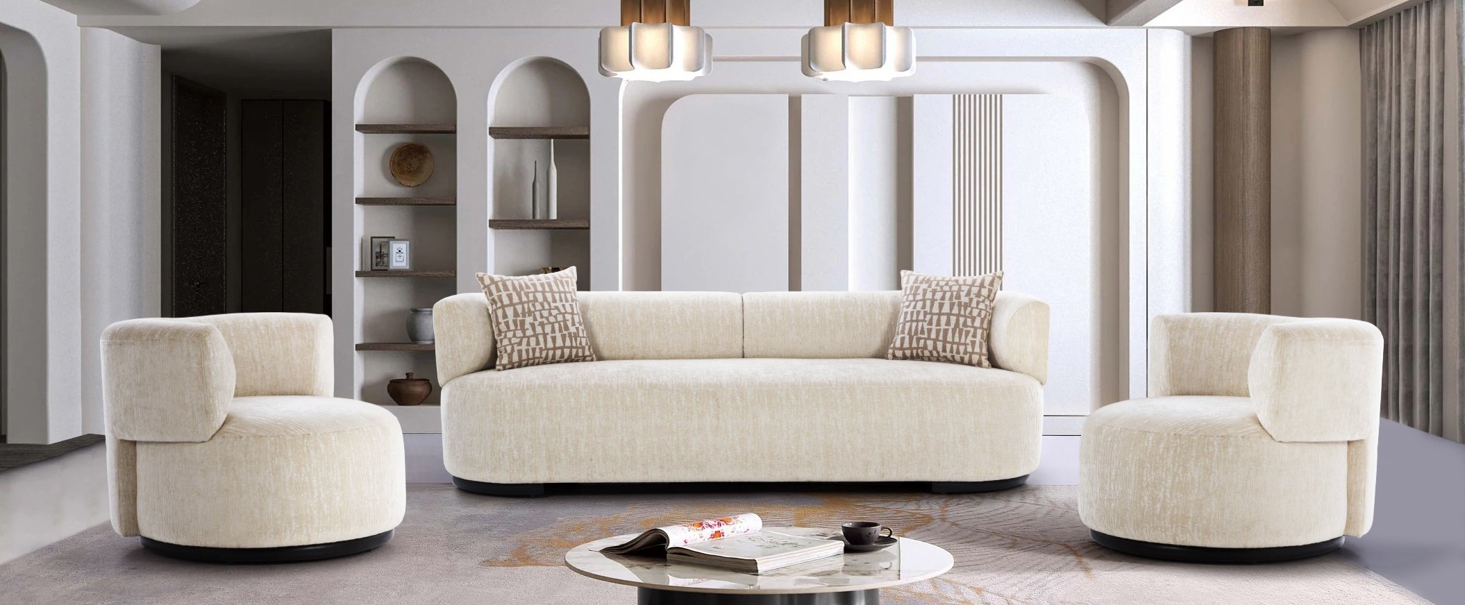 Modern elegance redefined: Plush cream three-seater sofa and two armchairs. Rounded forms, generous cushions, premium textured fabric. Subtle black plinth bases. Stylish accents. Exceptional comfort, refined aesthetic. Centerpiece for discerning homes.