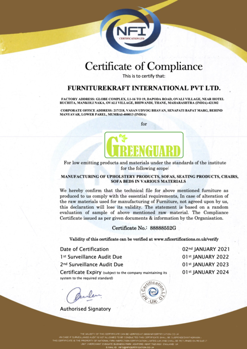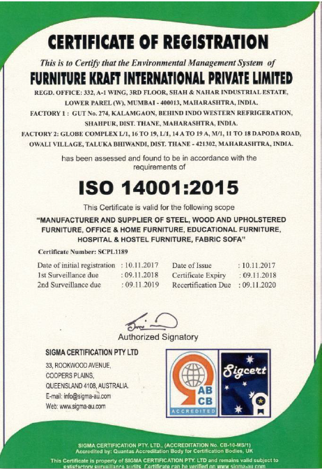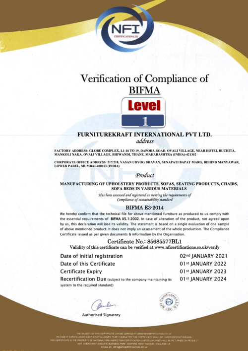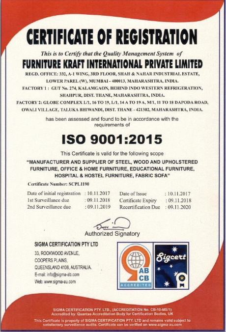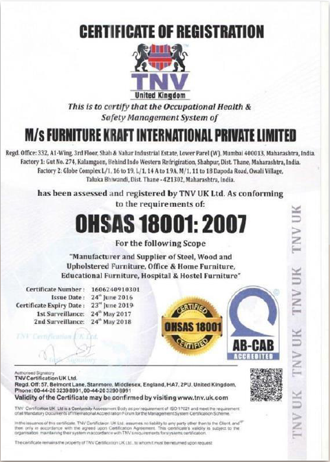 Our parent company, FurnitureKraft International Pvt Ltd meets numerous international quality accreditation standards, including BIFMA, Greenguard, ISO and OHSAS standards. As one of the leading furniture manufacturers in India, our exports span across 28 countries and we make sure to match quality assurance requirements throughout every stage of the procurement and production process.